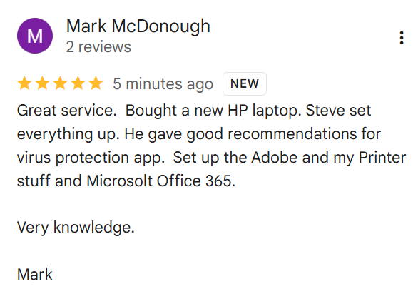 Steve is my "go to guy" for anything computer related. Always willing to help out with my very limited technical computer skills, repairs my computer in a timely manner and always stands behind his work. No one better in Simcoe or area for computer issues of any kind in my opinion.